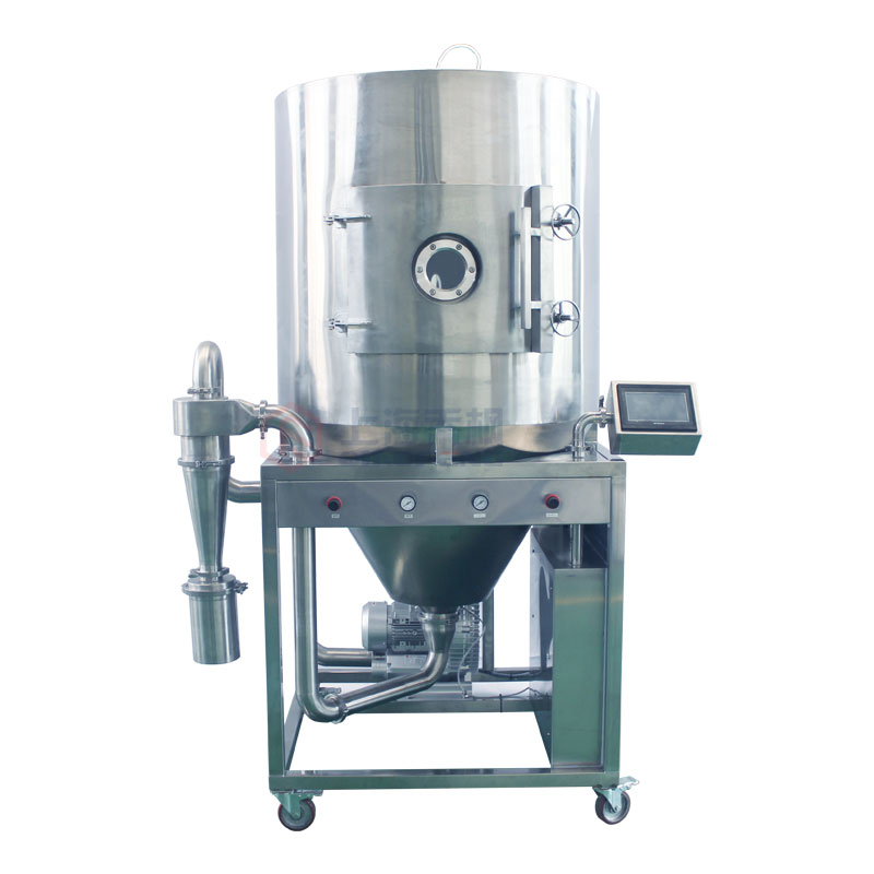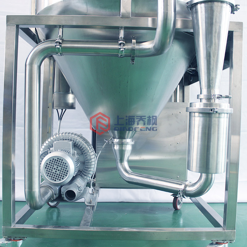 該機(jī)組核心裝置為造粒霧化器。藉此將液體霧化成微米級(jí)霧滴后被熱風(fēng)迅速干燥,干燥后的顆粒經(jīng)過底部收料瓶回收,粉末經(jīng)過旋風(fēng)分離器回收。設(shè)計(jì)進(jìn)風(fēng)溫度*高為250℃,出風(fēng)溫度為145℃左右。
